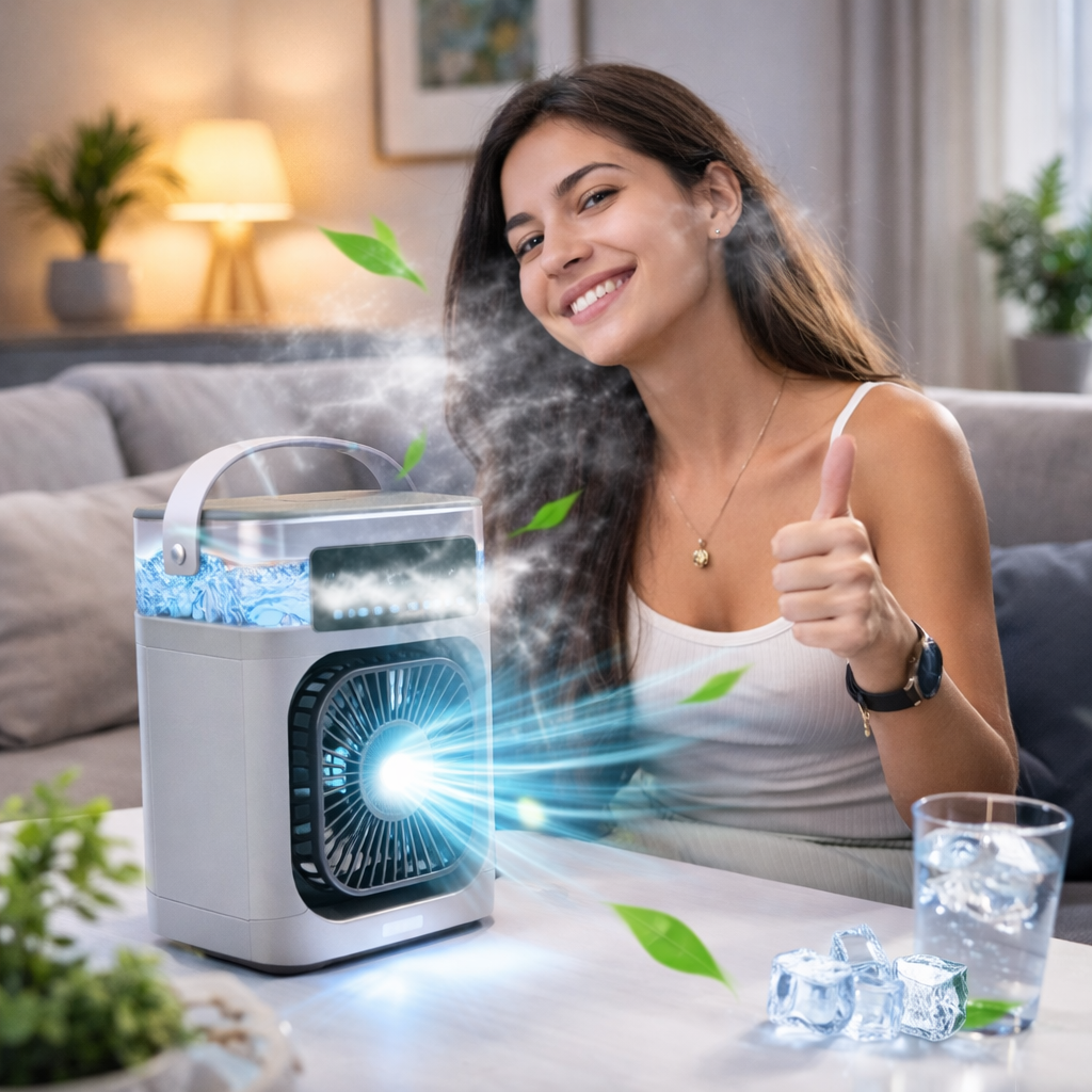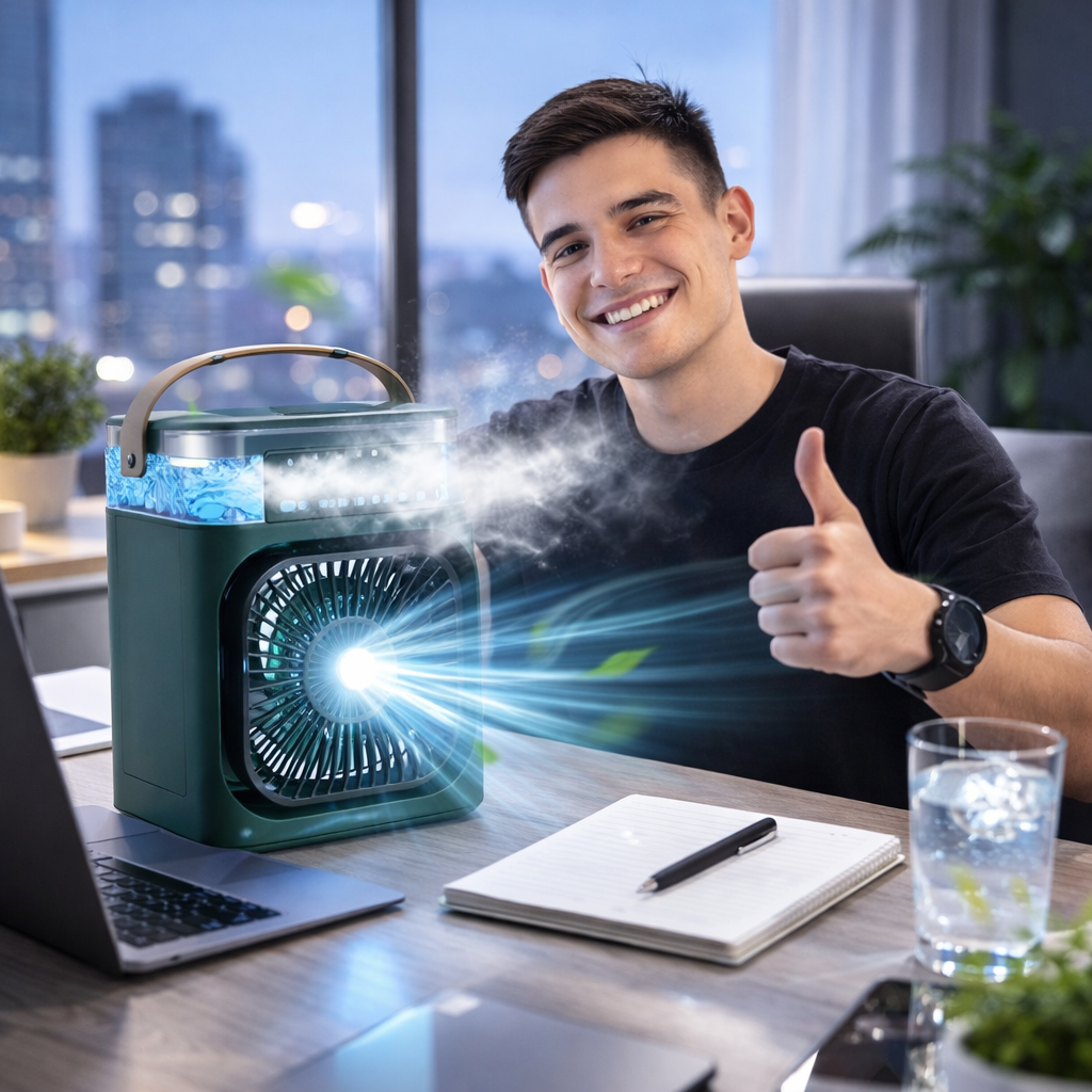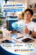 Es un humidificador portátil con efecto refrescante, pensado para uso personal y ahorro de energía, no para enfriar habitaciones grandes.